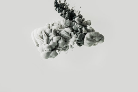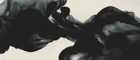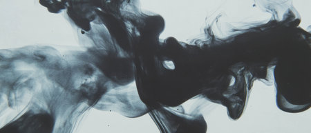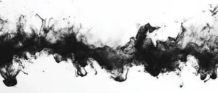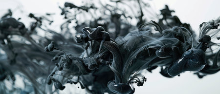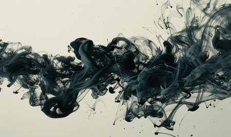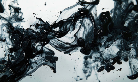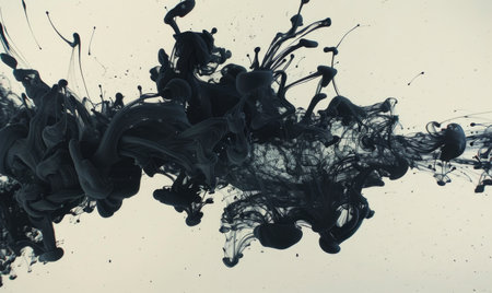 Black ink spreads and merges within a liquid, creating dynamic, abstract shapes. The composition features flowing lines and textures against a light background. This visual could be utilized in design projects or commercial artwork seeking an artistic, eye-catching element. It is suitable for various creative applications.
