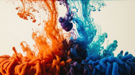 A captivating image showcasing a burst of colorful inks blending together. The inks, in shades of orange, blue, and purple, create a mesmerizing visual effect as they swirl and mix. The dynamic patterns formed by the inks give a sense of movement and energy.