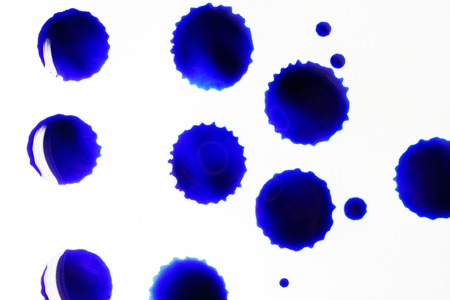 multiple blue spots on white background, spots of translucent liquid with a reflection