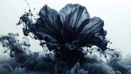 Black ink blooms create intricate textures on a stark white background