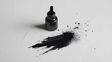 A minimalist composition featuring a single ink bottle and a bold ink blot spreading on a sheet of paper.