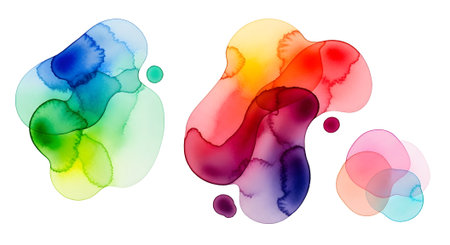 A collection of colorful alcohol ink abstract art blots, featuring a gradient of hues from blue and green to red and yellow, with smaller complementary shapes, all set against a clean white backgroun.
