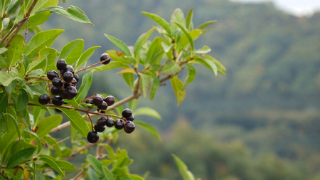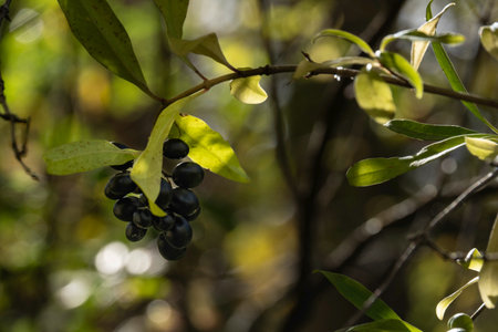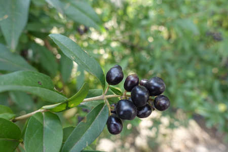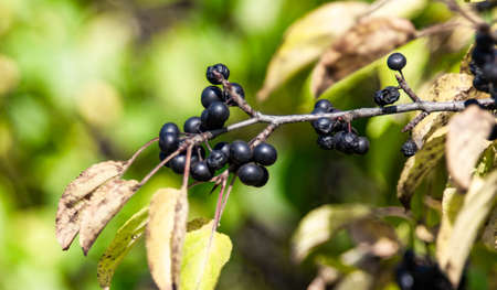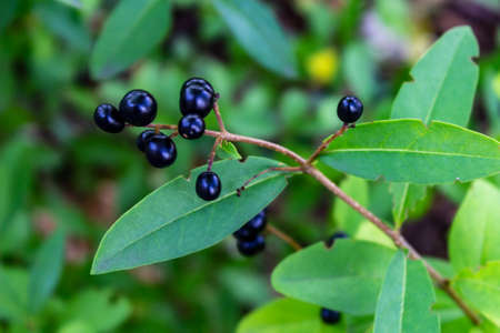 Wild privet or common privet or European privet Ligustrum vulgare fruit and berries isolated on a natural green background.