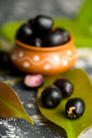 Jambolan plum or jambul or Jamun fruit, Java plum (Syzygium cumini) with leaf on stone textured background.