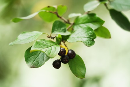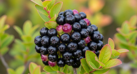 Black chokeberry ripening on branch. Aronia melanocarpa, closeup.