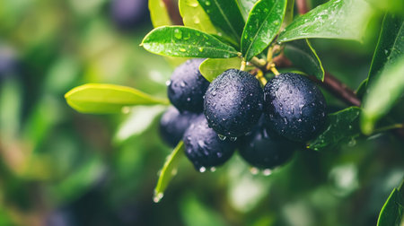 Fresh black olives on the tree, green leaves, and water drops enhancing the natural beauty