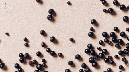 A close-up view of dark berries scattered across a smooth surface, capturing their rich color and texture in natural light, ideal for creative projects and food photography.
