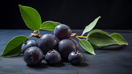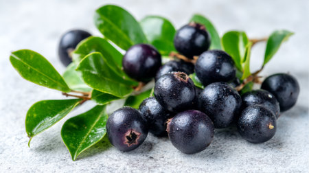 This image features fresh black berries alongside vibrant green leaves on a textured gray background, offering an appealing visual for food-related and health-focused projects.