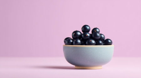 A beautiful display of fresh blackcurrants in a light pastel bowl set against a soft pink background. Ideal for promoting healthy eating and vibrant snacks.