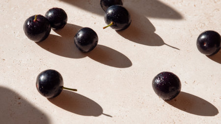 A captivating arrangement of fresh black cherries on a light beige surface illuminated by natural sunlight, highlighting their vibrant color and texture.