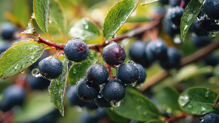 A panoramic wide view of Chokeberry field growing closely together under light drizzle soft raindrops on leaves ultra realistic photography natural daylight cinematic wide composition lifelike natural scene
