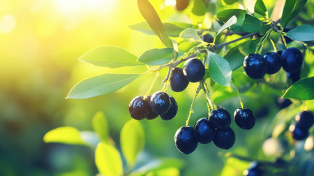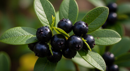 A closeup of fresh black berries hanging on a green plant with sunlight filtering through leaves, showcasing vibrant colors of nature in a tranquil setting.