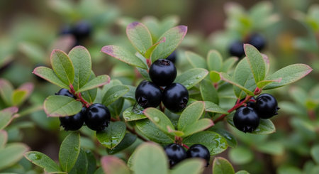 the photo showcases a vibrant scene of blueberry-covered trees, glistening with water droplets. captured in the style of the tokina at-x 11-16mm f/2.8 pro dx ii lens, the image exhibits organic realism and smooth, shiny textures. set against the backdrop of norwegian nature, the composition features complementary colors and a soft-focus technique, resulting in stunning color gradients. ai generated