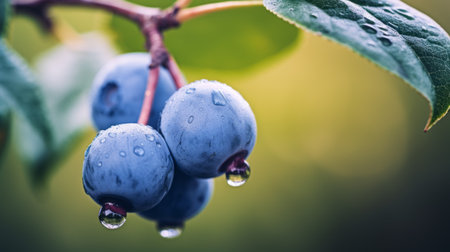A beautiful closeup view of vibrant wild blueberries clinging delicately to a branch amidst a lush, rainy forest, showcasing the incredible and vibrant beauty of nature in its purest form