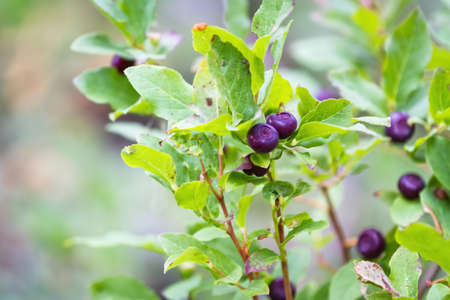 fresh huckleberries in the southern Oregon cascades on the plants using a macro lens for close up detail and a soft background