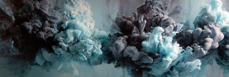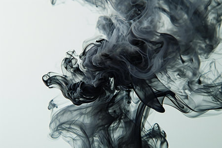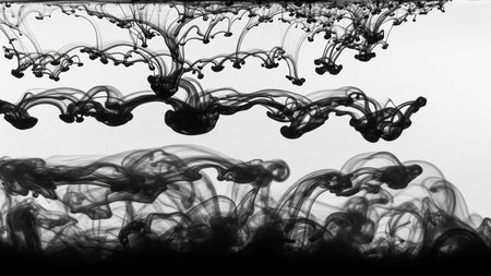 An artistic composition showcases black ink dissolving in water, forming intricate, swirling shapes. The image displays a macro perspective with high contrast, emphasizing the textures and fluidity. This image presents a dynamic visual for creative projects and editorial purposes. The shot uses studio lighting.