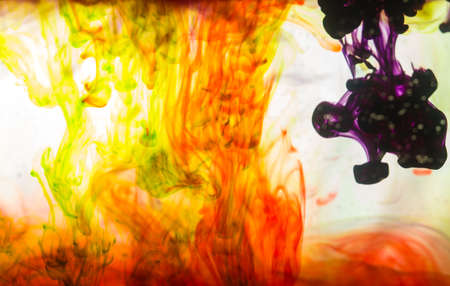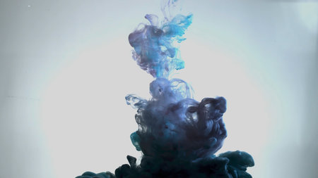 Ink swirl in a water on white background. The paint in the water. Soft dissemination a droplets of colored ink in water close-up. Explosion of color splashes acrylic ink.
