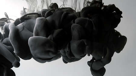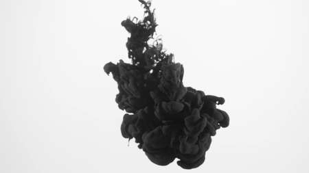 Desktop wallpaper. Black cloud of ink on a white background. Creative hyptonic background. Black watercolor paints in water on a white background. Environmental pollution concept.