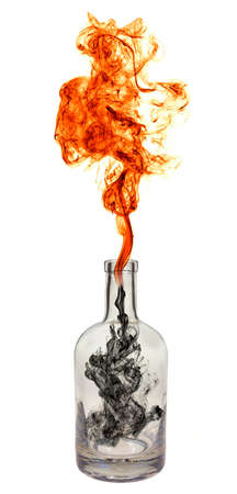 A miniature volcano erupts inside a glass jar, emitting smoke and a bright orange glow