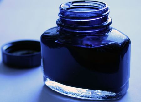 A tipped ink bottle surrounded by splattered ink blots in vibrant shades of purple and blue.