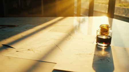 Inkwell on a table with sketches illuminated by sunlight, pencil, and window in the background.
