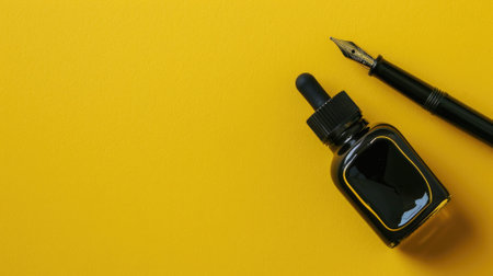 A glass ink bottle with a calligraphy pen resting beside it, surrounded by artistic ink stains.