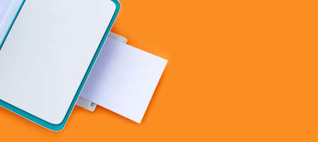 Printer and paper on orange background. Copy space