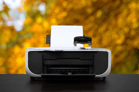 Office digital printer, copier and paper on wooden desk, fax machine close-up modern