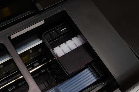 Close up of a multicolor ink cartridges container of a inkjet printer