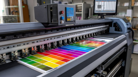 A printing machine creates vibrant color samples showcasing advanced technology in an industrial setting.