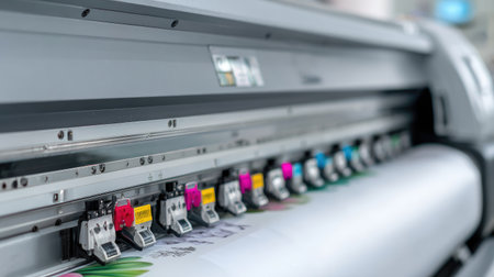 This image showcases a high-resolution digital printer featuring vibrant ink cartridges, illustrating a modern print shop's advanced printing capabilities for large formats.