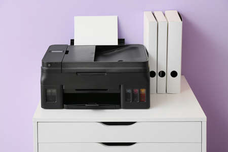 Chest of drawers with printer and folders near color wall