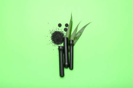 Composition with black bamboo sticks, activated carbon powder and pills on color background