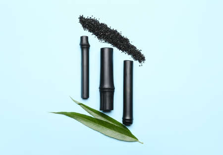 Composition with black bamboo sticks, activated carbon powder and leaves on blue background