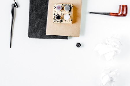 Writer workplace with tools, copybook and pen on white table background top view mock up