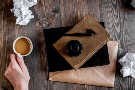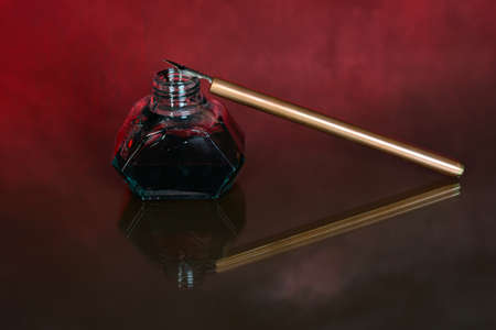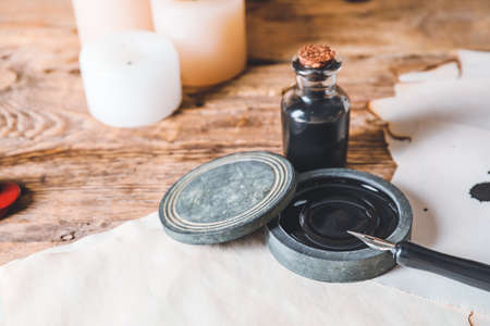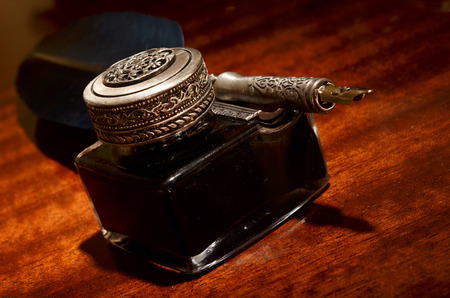 Calligraphy nib and ink in inkwell on a wooden table. Writing accessories in the old workshop. Dark background.