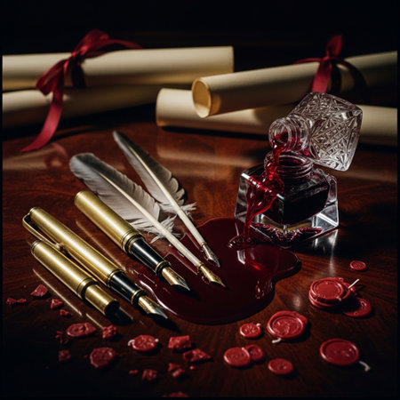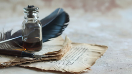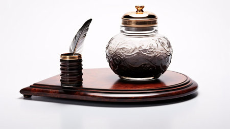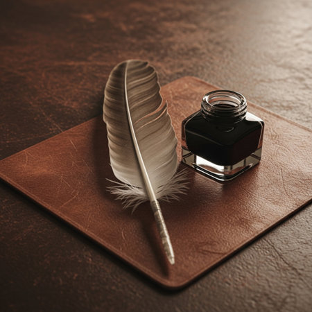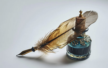 Feather quill and ink bottle on a marble surface, casting delicate shadows under warm studio lighting