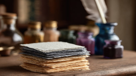 A visually captivating scene featuring a stack of handmade paper sheets alongside colorful ink bottles and a quill pen, perfect for creative projects and artistic inspiration.