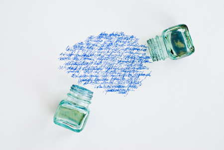 Overturned ink bottle with ink dripping off the edge of a glass table, creating bold stains.