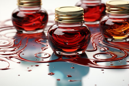 Abstract shapes formed by ink drops near a classic glass ink bottle in a minimalist setting.