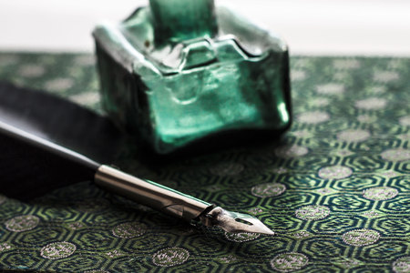 Close-up of a fountain pen on a notebook and several inkwells. Concept of writing poetry. International Poetry Day