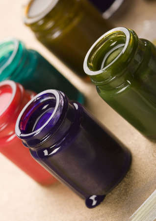Paint glass cans with purple, orange and blue paint on colorful background. House renovation. Hobby. Color therapy