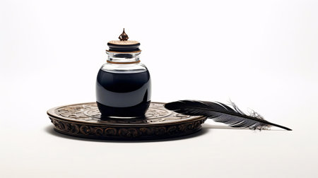 Feather pen inserted into ink bottle, elegant composition on a mirrored surface with soft reflections