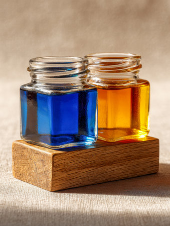 Amidst soft, warm glow, two petite glass containers showcase vibrant azure and rich amber hues, resting atop rustic wood on a textured cloth backdrop.