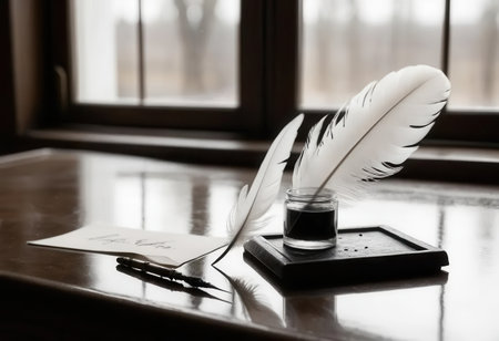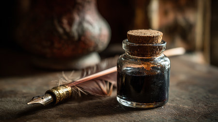 Elegant quill feather resting beside an open glass bottle of ink on an antique wooden desk, soft natural light streaming in