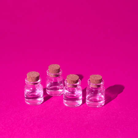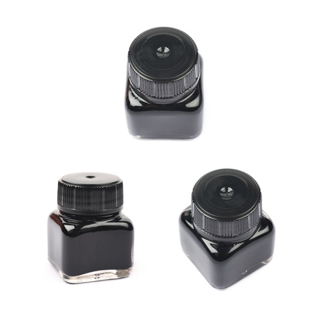 Tiny bottle filled with the black ink, composition isolated over the white background, set of three different foreshortenings