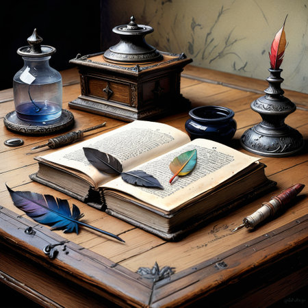 A captivating arrangement on a vintage desk showcases an array of antique writing tools, including pens, inkwells, and parchment papers, illuminated by soft natural light.