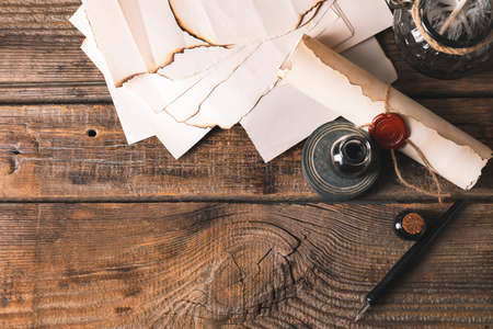 Old-fashioned quill pen and inkwell on a weathered manuscript