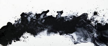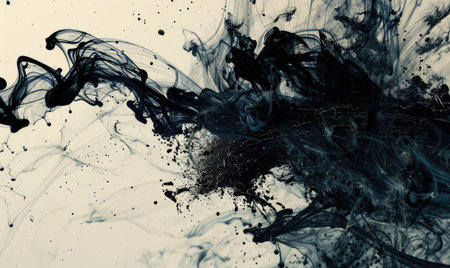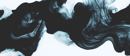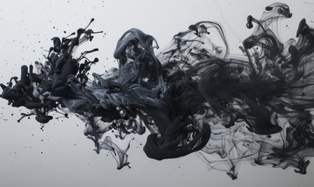 An artistic composition showcases black ink dissolving in water, forming intricate, swirling shapes. The image displays a macro perspective with high contrast, emphasizing the textures and fluidity. This image presents a dynamic visual for creative projects and editorial purposes. The shot uses studio lighting.