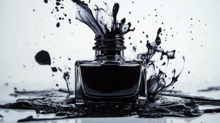 Abstract shapes formed by ink drops near a classic glass ink bottle in a minimalist setting.